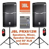 JBL Powered 12" PRX612M Live Loudspeakers, Mixer, Stands and Cables Set New